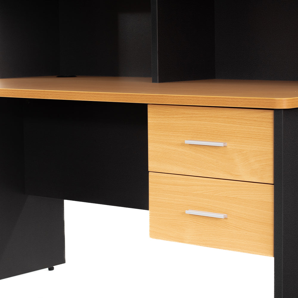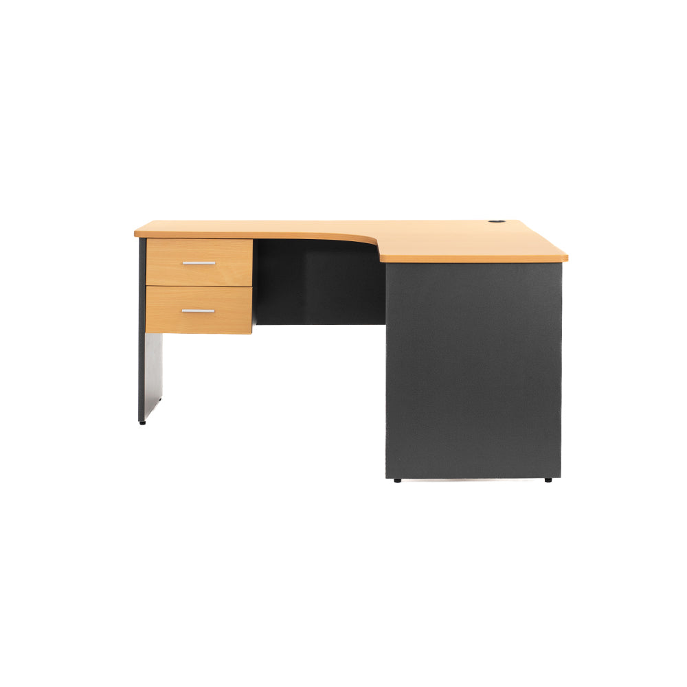 !Hazlo fácil! con este escritorio en L de 150 cm por lado y 60 cm de profundidad es ideal para maximizar la funcionalidad en oficinas dinámicas. Fabricado con tablero de MDF de 25 mm de espesor, laminado en PVC, con un set de 2 cajones, combina durabilidad con diseño. Las esquinas redondeadas y los acabados modernos en haya y gris Oxford lo convierten en un mueble vistoso, práctico y profesional. Mueble de grado comercial con disponibilidad inmediata y envío a toda la República.